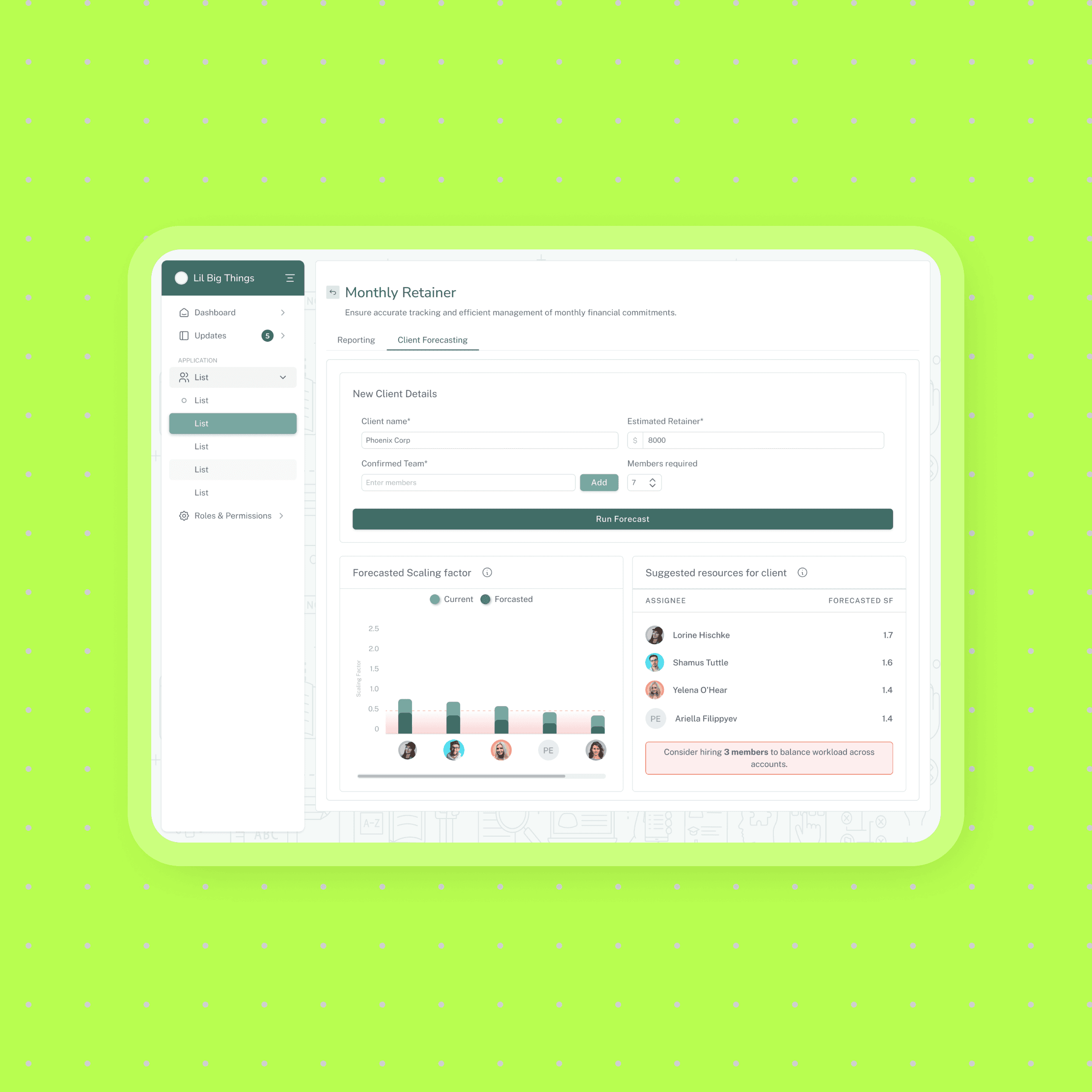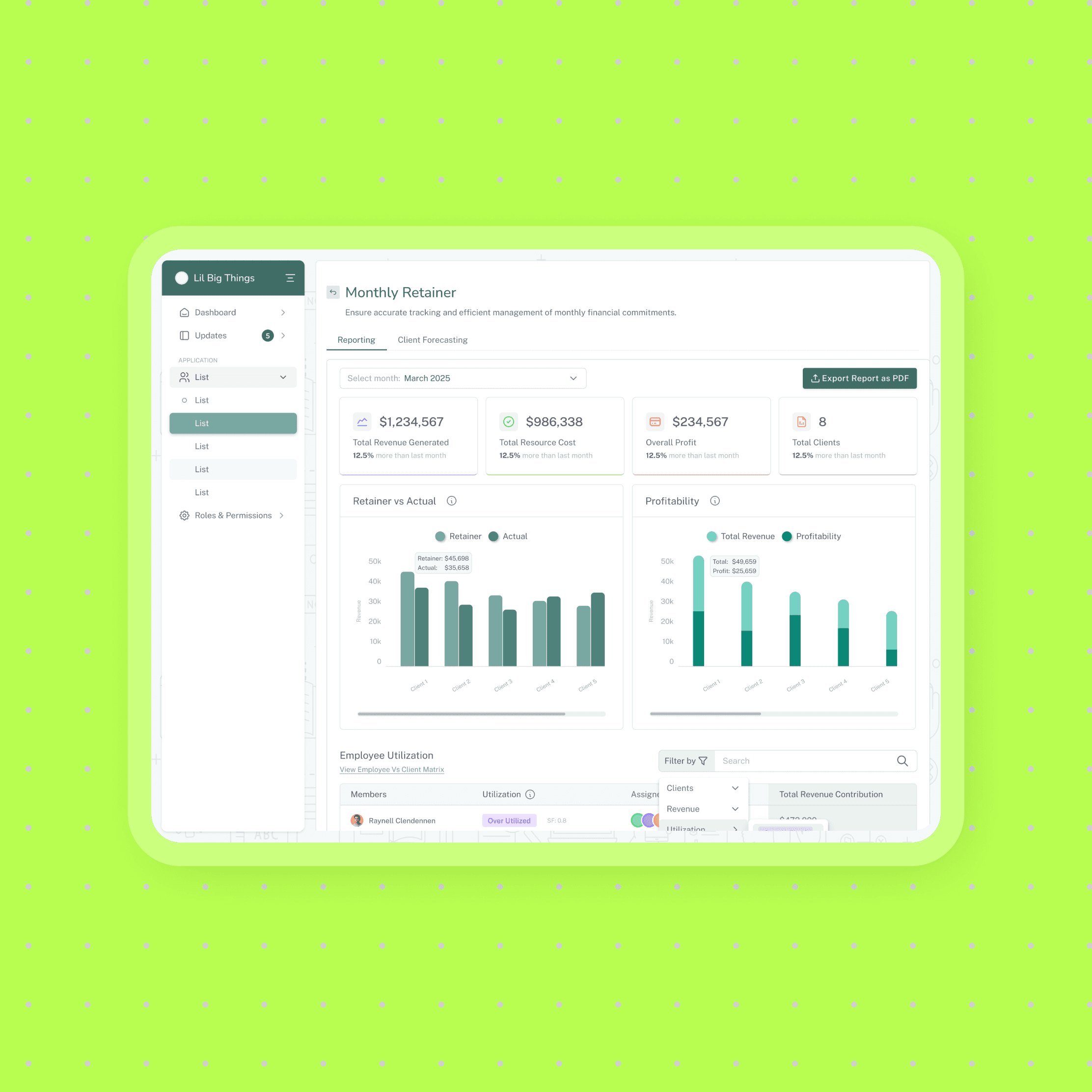 Know exactly what scope is left, no back-of-napkin math. Live dashboards map deliverables, employee capacity, and value to each retainer against work delivered and operational analytics.