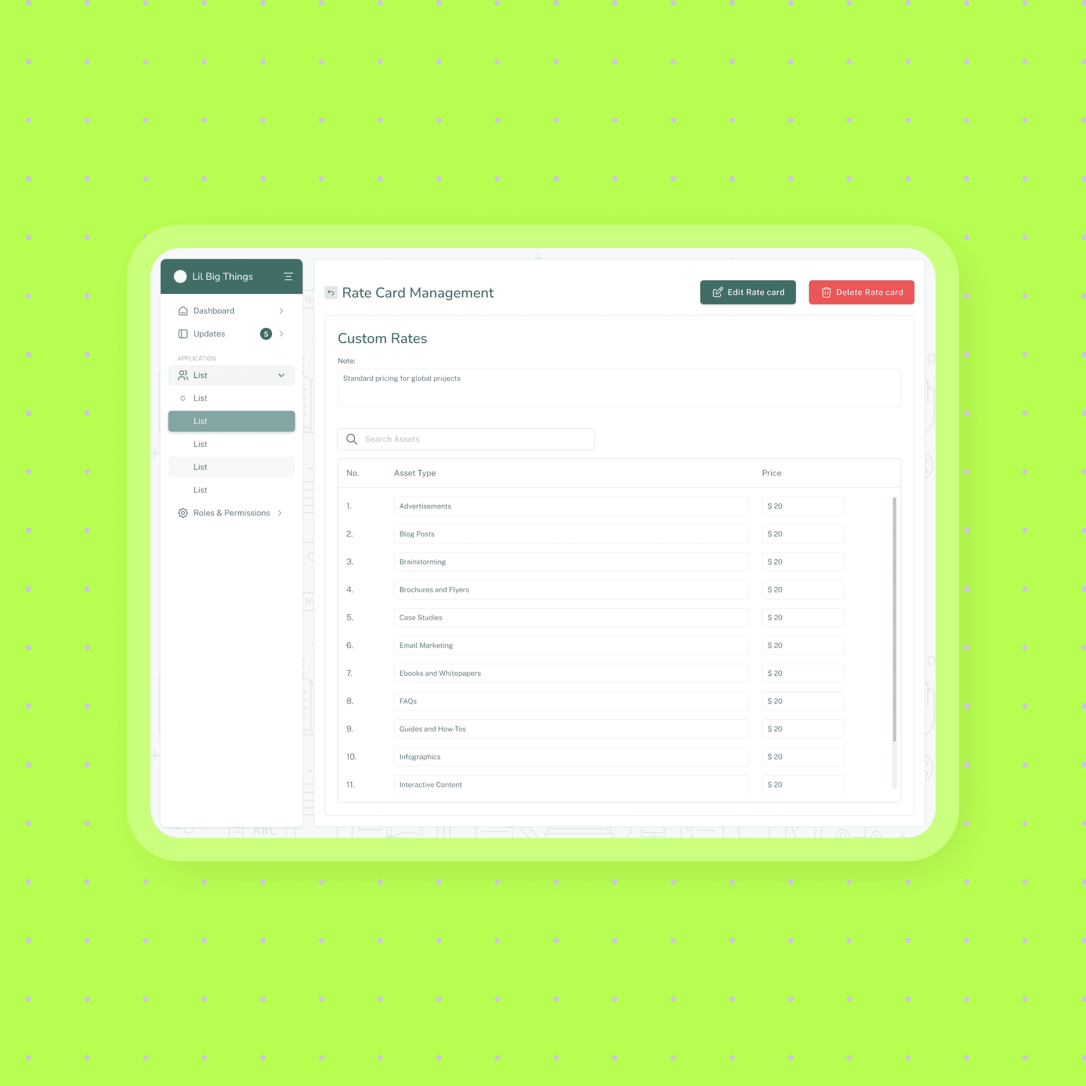 One source of truth for “how much we charge.” Set global, client-specific, or service-level rates that are instantly applied to new projects and tracked against actuals.