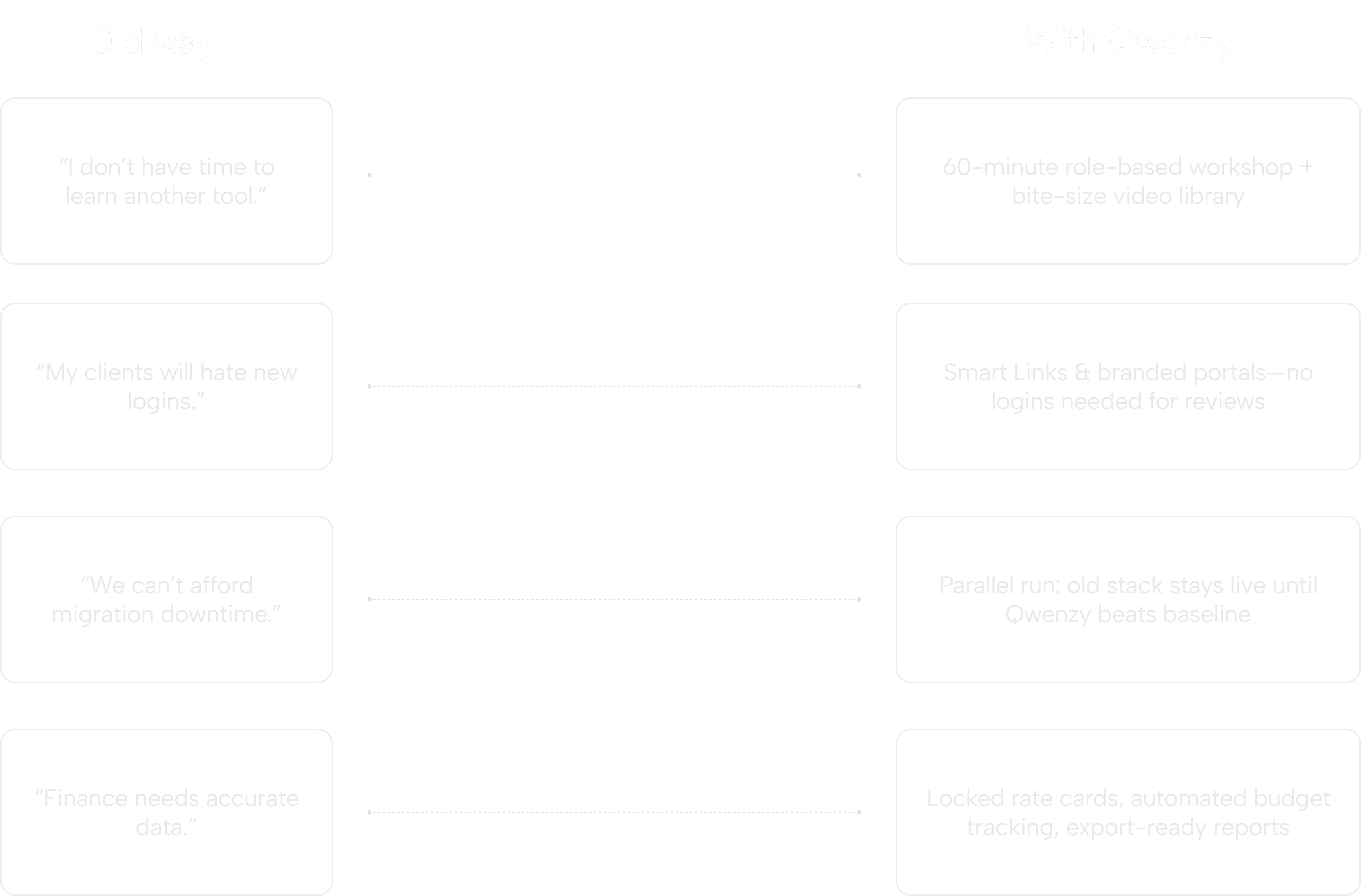 Prove value in a controlled sandbox. Pick a low-risk, high-visibility client or campaign. Import brief, tasks, assets, and timelines. Track time-to-approval and delivery vs. your baseline.